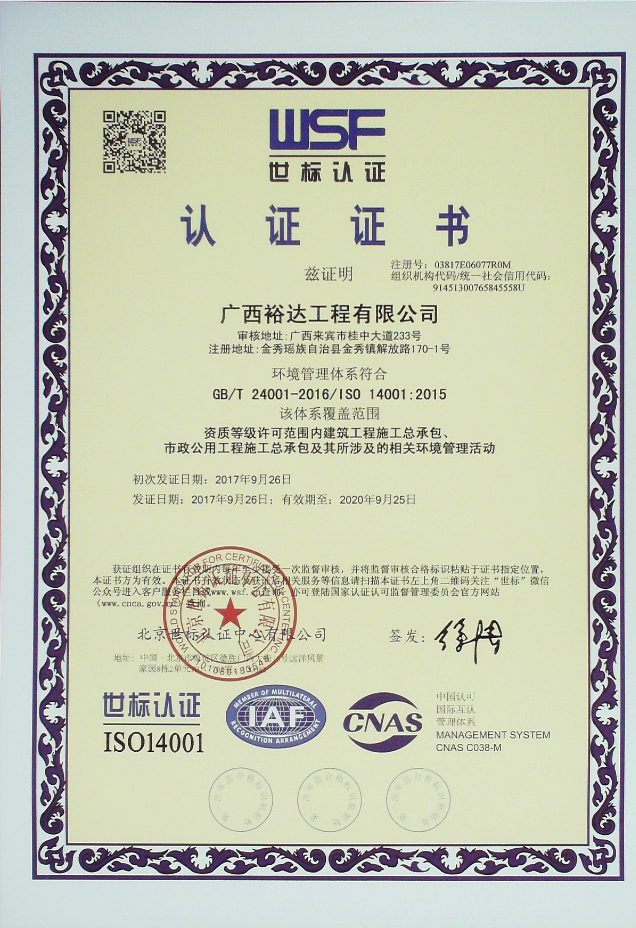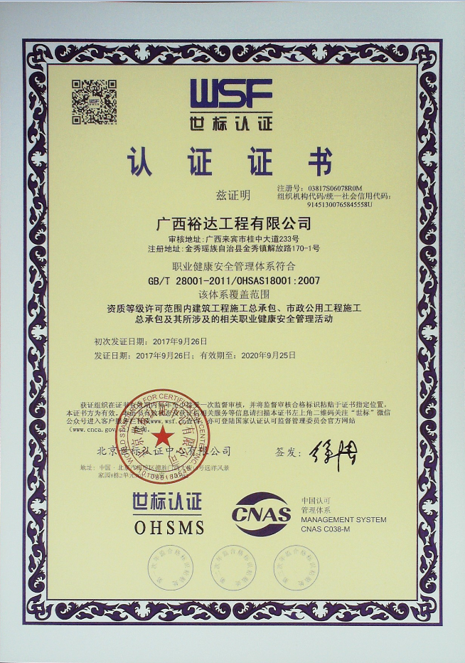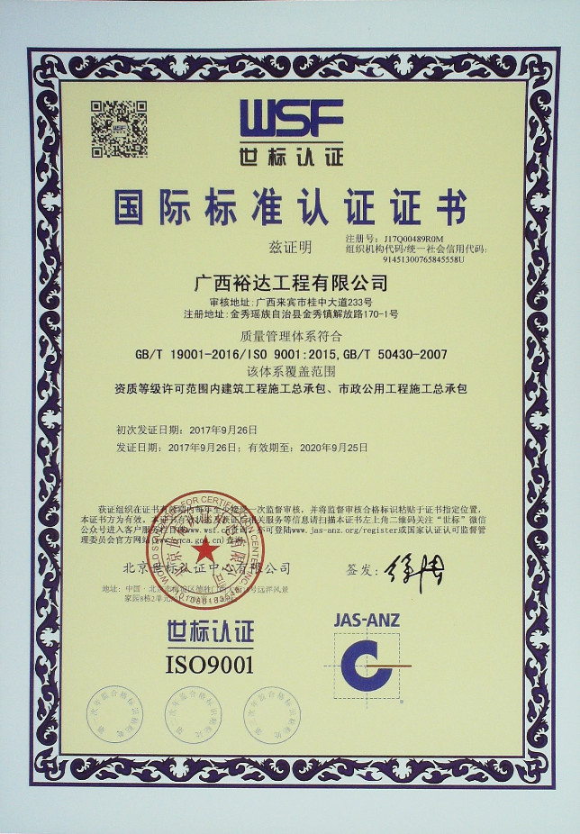 2017年9月7日至16日,经过专家组两轮现场审核,九游·体育(jiuyou.com)官方网站顺利通过了GB/T19001-2016《质量管理体系》、GB/T24001-2016《环境管理体系》、GB/T28001—2011《职业健康安全管理体系》、GB/T50430-2007《工程建设施工企业质量管理规范》三标一体的认证,并于2017年9月26日获得由北京世标认证中心有限公司颁发的ISO9001:2015、GB/T50430-2007、ISO14001:2015和GB/T 28001-2011的认证证书。