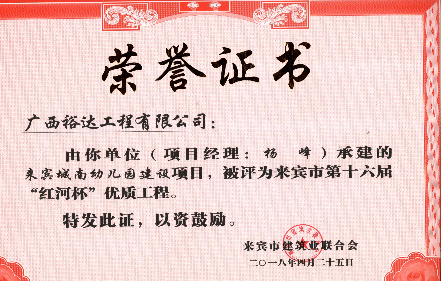 近期,从来宾市建筑业联合会传来喜讯,九游·体育(jiuyou.com)官方网站承建的“来宾城南幼儿园建设项目”“来宾市城南初级中学建设项目”“来宾飞龙小学建设项目工程总承包”“裕达·金碧天誉B区17#楼”和“裕达·金碧天誉B区18#楼”共5项工程项目被评为来宾市第十六届“红河杯”优质工程,这是继2011年至2017年荣获的25项“红河杯”优质工程之后,再获此荣誉。