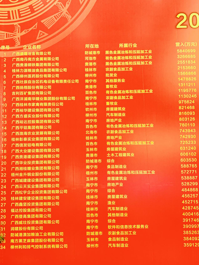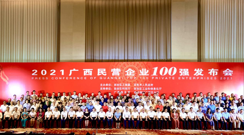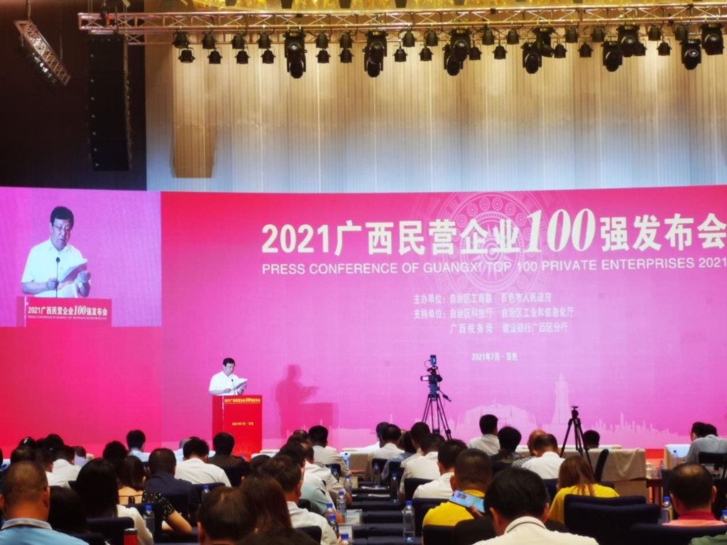 7月23日上午,2021广西民营企业100强发布会在百色饭店一楼国际会议中心举行。本次发布会由广西工商联、百色市人民政府主办,广西科技厅、广西工业和信息化厅、广西税务局、建设银行广西区分行协办。自治区人大常委会副主任赵乐秦、自治区副主席费志荣,自治区政协副主席、工商联主席磨长英,中共百色市委书记周异决,百色市市长葛国科等领导出席活动,我集团董事长邓亚保应邀出席。
