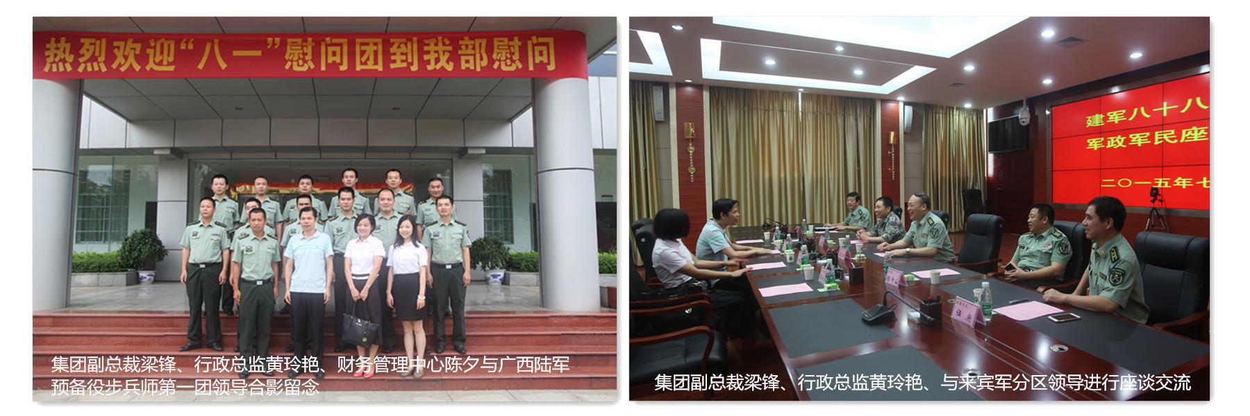 幸福不忘拥军,安定不忘国防。今年是中国人民抗日战争暨世界反法西斯战争胜利70周年及建军88周年。2015年7月31日,在“八一”建军节到来之际,我集团副总裁梁锋与行政总监黄玲艳先后走访慰问了广西陆军预备役步兵师第一团、中国人民解放军广西来宾市军分区、武警来宾市消防支队和武警来宾市支队的官兵,代表集团总裁邓亚保及全体员工向他们送去节日的祝福和诚挚的问候,集团财务管理中心副总经理陈汐、行政管理中心行政部副经理覃婷婷陪同慰问。