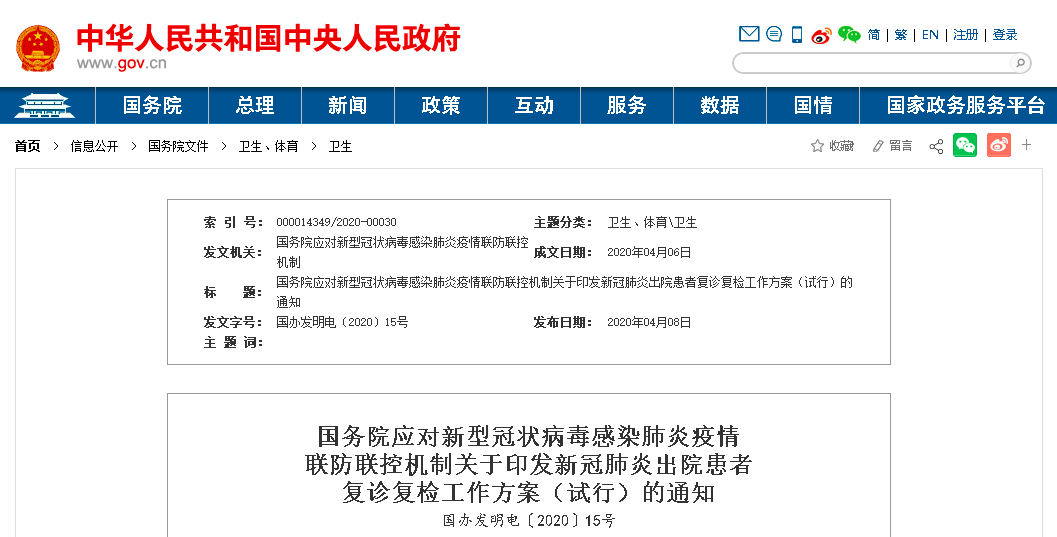 国务院应对新型冠状病毒感染肺炎疫情联防联控机制关于印发新冠肺炎出院患者复诊复检工作方案(试行)的通知