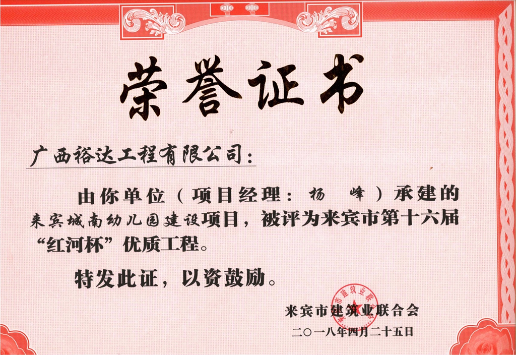 2018年来宾市第十六届“红河杯”优质工程(来宾城南幼儿园建设项目)